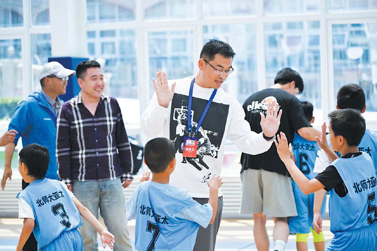 2025年,北师大亚太实验学校老师在篮球比赛中鼓舞小队员们。 受访者供图