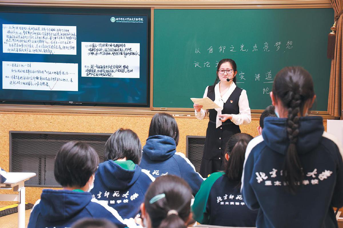 在北师大亚太实验学校30周年校庆成果汇报研讨会上,董有贤老师给九年级学生上语文研究课《以信仰之光,点亮梦想》。 受访者供图